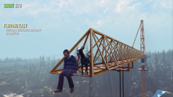 «Песочница» с крохотным миром, в котором нужно ставить рекорды и набирать очки, выполняя задания. Игровой процесс завязан на уничтожении всех объектов и выкрутасах главного героя. Мне это напомнило FlatOut 2, а конкретнее — момент, когда водитель выстреливал через лобовое стекло и собирал своим несчастным телом заборы пополам с коробками и шинами. Только в Goat Simulator дрянная физика, картонный мир и непередаваемая скука. Поначалу можно развлечь себя поиском сюрпризов и скрытых возможностей, но этого занятия хватает на считаные минуты. Ну хорошо, залезли на ракету и взлетели в воздух. Ладно, поднялись на башенный кран и столкнули рабочего вниз. Взорвали бензоколонку, получив награду «Майкл Бэй». Где тут смеяться-то?