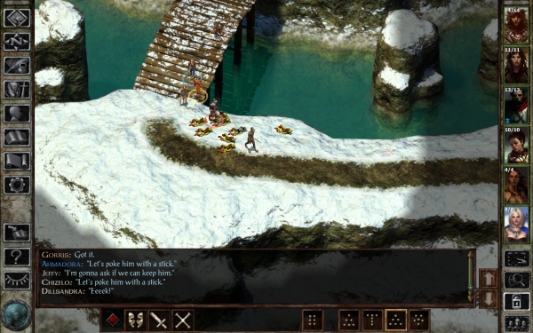 Причем предыдущая фраза отнюдь не фигуральная. Все-таки нынешние cRPG обмельчали и скатились в сторону динамичных боев — кубик бросать уже никому не интересно. Тем приятнее было вновь окунуться в холодный мир Icewind Dale, где можно часами составлять себе партию, распределяя очки опыта, и все равно пасть смертью храбрых от рук первых же попавшихся врагов. Или смотреть, как рыцарь тщетно размахивает мечом перед мордой волка, а бравая лучница настолько косоглаза, что не может попасть в противника с нескольких метров.