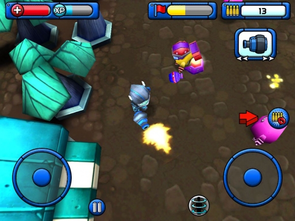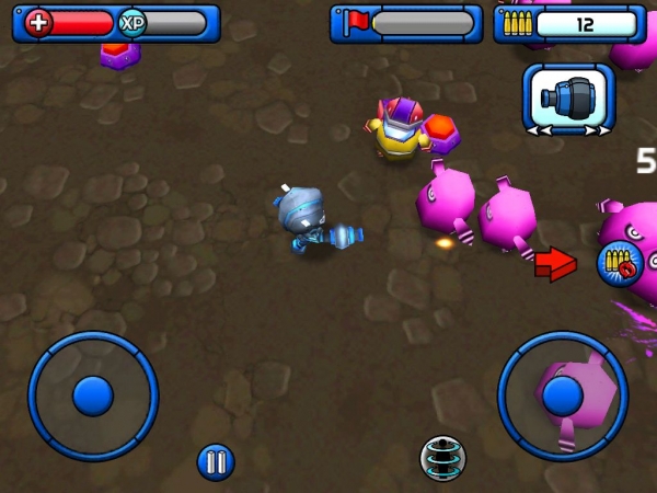 Зато к управлению претензий нет: передвигается Экон с помощью левого виртуального стика, стрельба и прицеливание осуществляются правым. Есть также кнопка перезарядки, которой вы никогда не воспользуетесь (обоймы тут крошечные), а в верхней части экрана можно переключать оружие. Ни гранат, ни суперспособностей, ни чего-то ещё, что делало бы тридцатый уровень отличным от первого, — вы просто бегаете кругами и стреляете во все стороны под ритмичную музыку. Это успевает надоесть быстрее, чем игра закончится.