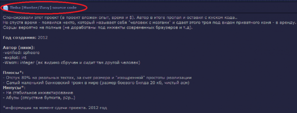 В Сети появился исходный код вируса Tinba, наименьшего в мире банковского трояна. Сейчас им обмениваются пользователи подпольных специализированных форумов. Троян также известен под именами Tinybanker и Zusy, его размер составляет всего 20 Кбайт. После своего появления в 2012 году этим вирусом были заражено свыше 60 000 устройств.