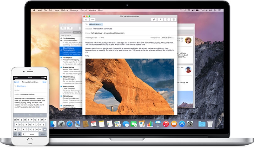 В новой версии Mail появилась функция Mail Drop для отправки вложений объёмом до 5 Гбайт. Усовершенствованное приложение Сообщения позволяет добавлять участников в начатые разговоры, видеть местонахождение собеседников и быстро открывать вложения.