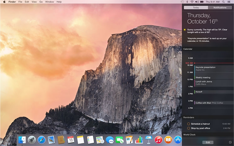 О новшествах Yosemite уже говорилось, но нелишним будет сегодня напомнить ключевые особенности обновления. Операционная система получила новый более современный минималистический интерфейс в духе iOS 7 и 8, полагающийся на плоские динамические цвета и прозрачность. Переработаны значки приложений и улучшен системный шрифт, которые не только стал удобнее для восприятия, но также использует преимущества экрана Retina, которым теперь оснащён и новый 27» iMac.