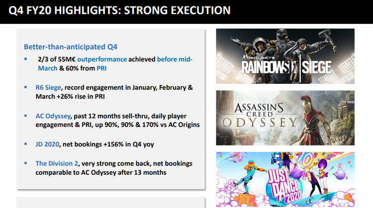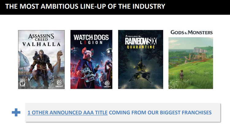 До 1 апреля 2021 года выйдут Assassin’s Creed Valhalla, Watch Dogs: Legion, Gods & Monsters, Rainbow Six Quarantine и одна неанонсированная игра. Три из них (включая новую Assassin’s Creed) появятся в третьем квартале (1 октября — 31 декабря), а ещё две — в последнем. Однако ситуация с COVID-19 может привести к отсрочке релиза одного из пяти проектов (какого именно, не уточняется). Также издатель собирается выпустить несколько небольших игр в духе Roller Champions.