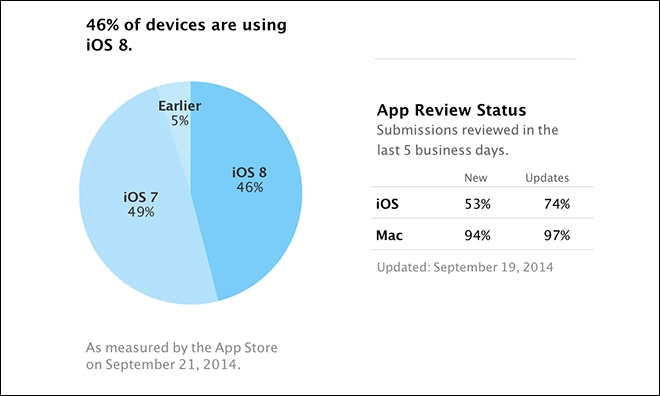 Как теперь сообщается, спустя пять дней после выхода iOS 8 эта ОС была инсталлирована приблизительно на 46% всех находящихся в обращении Apple-гаджетов. В то же время доля iOS 7 сократилась с более чем 90% до 49%. На все прочие версии операционной системы iOS в настоящее время приходится в общей сложности примерно 5%. Приведённая статистика основана на посещаемости онлайнового магазина Apple App Store.
