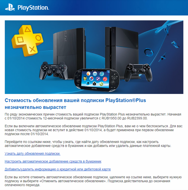 С 1 октября 2014 года Sony увеличила стоимость подписки на PlayStation Plus в России. Об этом компания сообщила в письмах, разосланных пользователям этого сервиса.