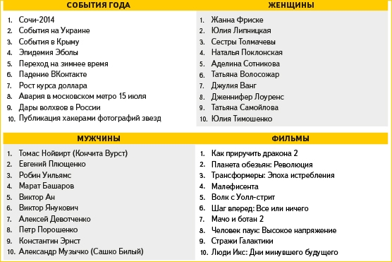 В группе «Женщины» на первом месте оказалась Жанна Фриске, а в категории «Мужчины» — Томас Нойвирт, более известный как Кончита Вурст. Самыми популярными фильмами названы «Как приручить дракона 2», «Планета обезьян: Революция» и «Трансформеры: Эпоха истребления».