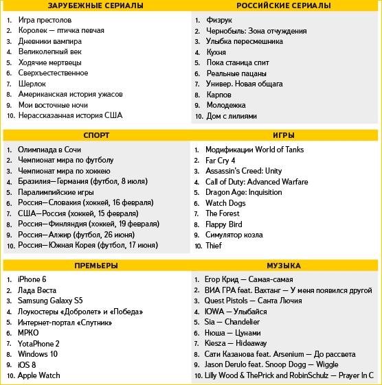 В группе «Игры», по данным «Яндекса», чаще всего вводились запросы относительно World of Tanks. В категории «Премьеры» лидировали смартфоны iPhone 6, а самым популярным запросом на музыкальную тему стал «Егор Крид — Самая Самая».