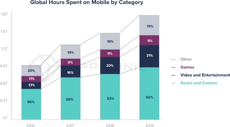 Половина времени, проведённого в мобильных приложениях в 2019 году, пришлась на социальные сети