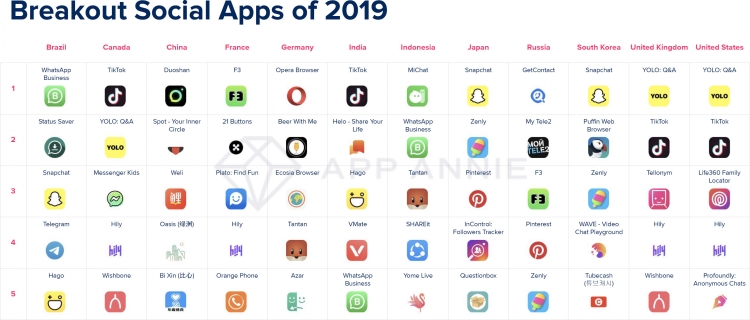 Лидером по загрузкам в 2019 году в России в категории «Социальные сети и коммуникации» стало приложение, позволяющее блокировать спам, GetContact. На втором месте — приложение оператора связи «Мой Теле 2», на третьем — F3, позволяющее общаться анонимно.