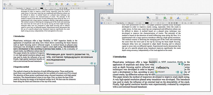 Приложение работает с Microsoft Word 2011, Apple iBooks, Apple TextEdit, Apple Pages и другими программами с поддержкой OS X Services, а также с браузерами Safari и Chrome. PROMT Агент переводит текст на странице источника, без переключений между окнами программ или вкладками браузера. Для получения перевода нужно выделить объект (слово, предложение, абзац) и нажать «горячую» клавишу — во всплывающем окне мгновенно появится текст на нужном языке. Такой способ работы обеспечивает простоту, удобство и высокую скорость перевода.