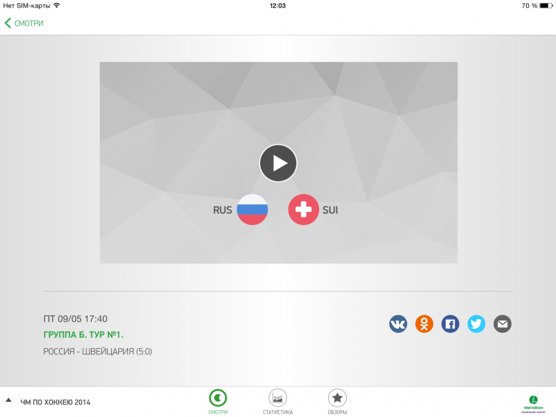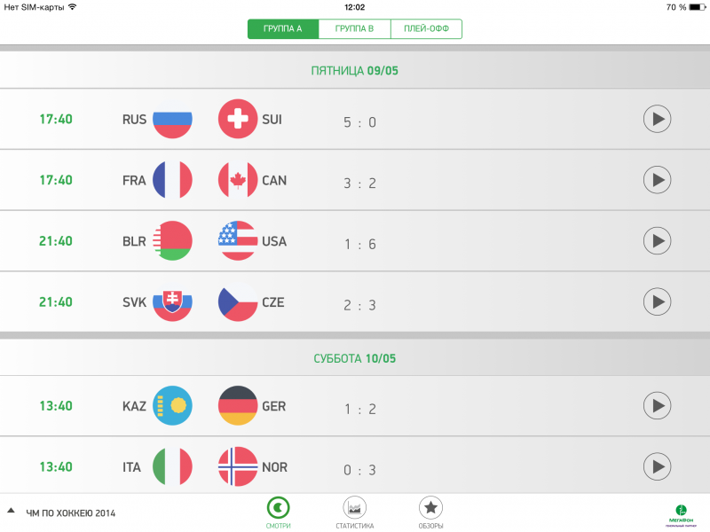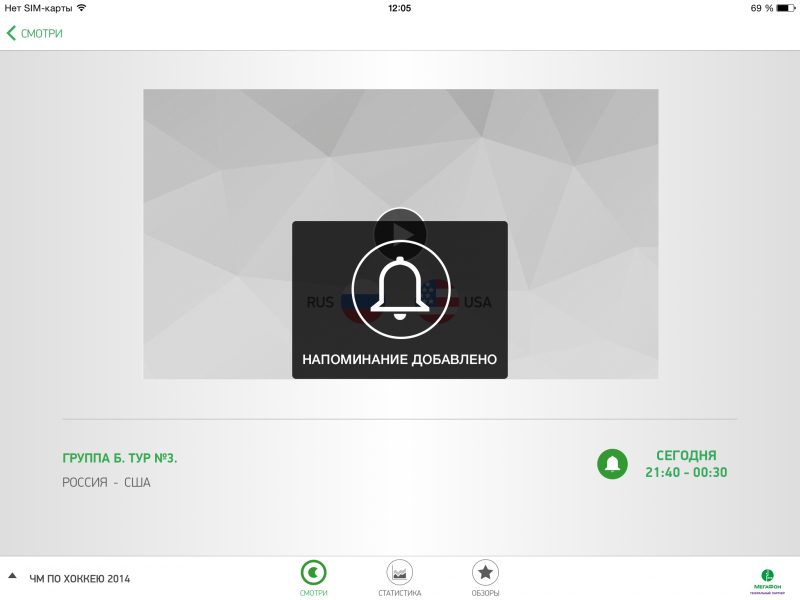Если ваша работа или другие обстоятельства не позволяют быть у телевизора в нужное время, а посмотреть матч нашей сборной очень хочется, то на помощь приходит приложение «СМОТРИ+» от МегаФона. Программа доступна на смартфонах и планшетах под управлением ОС Android и Apple iOS и совершенно бесплатна. Приложение позволяет смотреть матчи Чемпионата мира по хоккею в любой точке России в прямом эфире, так что поездка на дачу не станет препятствием ― смотреть матчи можно прямо в пробке! «СМОТРИ+» доступно для абонентов всех мобильных операторов, но пользователи МегаФона имеют преимущество ― интернет-трафик при просмотре видео из приложения не тарифицируется, причём не только в домашнем регионе, но и на всей территории РФ.