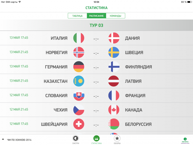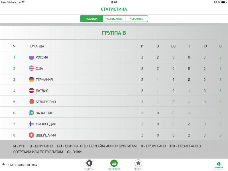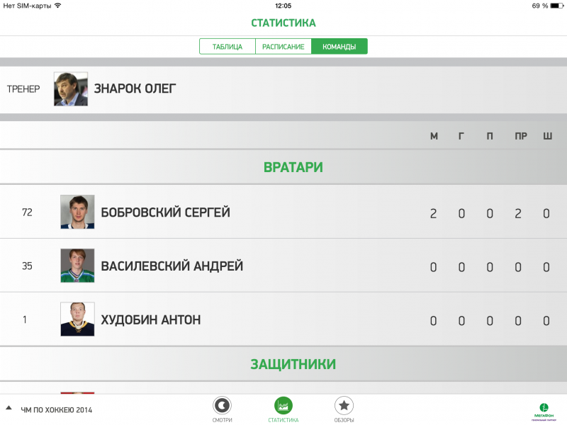 На второй вкладке пользователям доступны все статистические данные: турнирная таблица, расписание встреч и полная информация о командах, принимающих участие в Чемпионате. Можно, например, просмотреть весь состав сборной России и ознакомиться со статистикой любого игрока в рамках турнира.