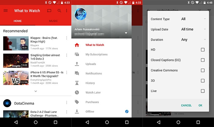 Переходя по каналам, пользователь также заметит изменения в соответствии с новым дизайном Google. Например, используется функция «Палитра» из Lollipop, которая подстраивает цвет канала с цветом его основного изображения. Среди функциональных новшеств можно упомянуть расширенные поисковые фильтры, позволяющие ограничить количество вариантов и более точно искать необходимые материалы.