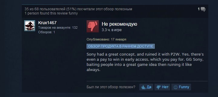 К списку игр, выпущенных в раннем доступе Steam и оказавшихся в центре скандала, прибавился онлайновый зомби-экшен H1Z1 от Sony Online Entertainment. Запуск игры, состоявшийся 15 января, был испорчен проблемами в работе серверов, а когда геймеры смогли подключиться, возникли претензии другого характера — многие решили, что вся игра построена вокруг микроплатежей. По второй причине издатель согласился вернуть деньги за неё всем, кто купил её на старте.