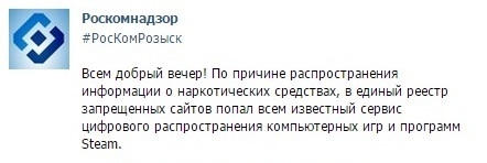 «По причине распространения информации о наркотических средствах, в единый реестр запрещённых сайтов попал всем известный сервис цифрового распространения компьютерных игр и программ Steam».