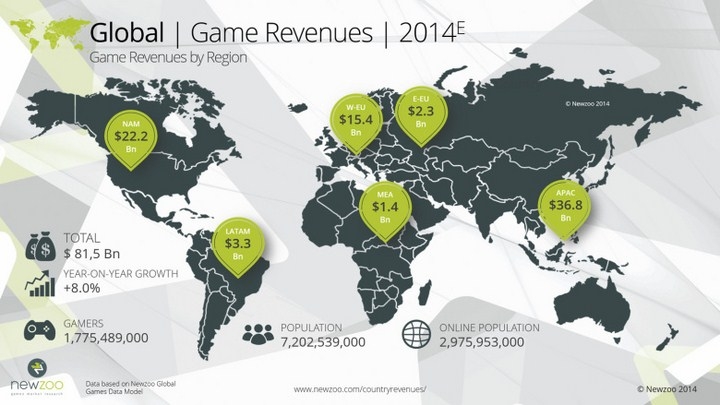 Аналитическая компания Newzoo, занимающаяся изучением рынка видеоигр в разных странах мира, опубликовала любопытные результаты своего очередного исследования. Согласно ему, из 7,2 млрд человек, живущих на нашей планете, у почти 3 млрд есть доступ к Сети, а 1,8 млрд являются геймерами. Также компания подсчитала, что до конца этого года поклонники игр потратят на своё увлечение почти $81,5 млрд.