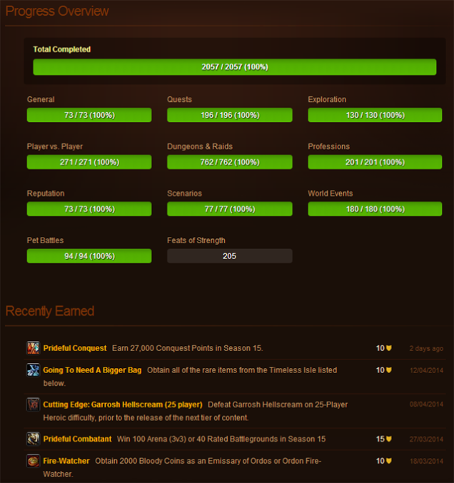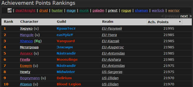 Российскому игроку в MMORPG World of Warcraft под псеводонимом Хируко первому в мире удалось получить все имеющиеся на данный момент 2057 «ачивок» и заработать рекордные 21 995 очков достижений — на десять больше, чем у нескольких ближайших преследователей.