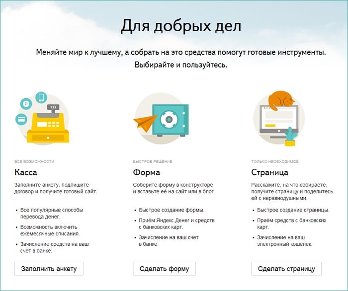 Новая краудфандинговая служба предоставляет три платёжных инструмента: это «Касса», «Форма» и «Страница». Через «Кассу» благотворительные организации, не беспокоясь о технической стороне дела, смогут принимать банковские карты, «Яндекс.Деньги», WebMoney, платежи со счёта мобильного телефона, наличные в терминалах и салонах связи, а также предлагать жертвователям возможность автоплатежа с карты и кошелька. Использовать «Кассу» могут только организации, у которых благотворительная деятельность предусмотрена уставом. После заключения необходимого договора «Яндекс» создаст платёжную страницу для фонда и в дальнейшем будет её поддерживать.