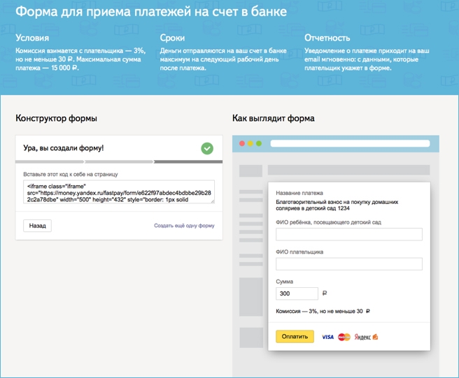 Инструмент «Форма» предназначен для организаций (юридических лиц). Он позволяет настроить простое и универсальное решение для получения денег в Интернете и встроить его в свой сайт с помощью iframe-кода. Посетители смогут платить банковскими картами и со счёта в «Яндекс.Деньгах», а их взносы поступят прямо на расчётный счёт организации.