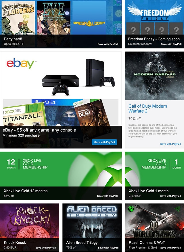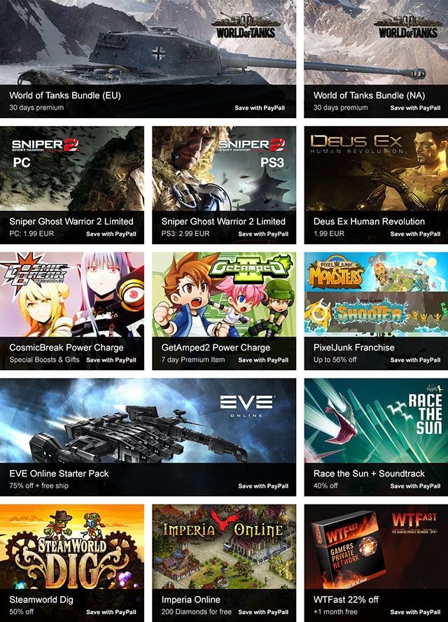 Magicians and Looters, EVE Burst Error и Omegalodon — скидки до 50%: три известных названия, которые могут предложить безумный и удивительный игровой опыт; Фантастический выбор игр от Desura; WTFast — 22% скидка + 1 месяц бесплатно: оптимизатор интернет-соединения, увеличивающий скорость передачи до 70%; Call of Duty Modern Warfare 2 — скидка 70%: продолжение одного из самых продаваемых боевиков от первого лица; Alien Breed Trilogy — скидка 75%: три аркадных боевика из одной коллекции с захватывающей одиночной кампанией, режимами выживания и кооперативом для двух игроков; eBay — скидка $5 на любые игры и консоли при покупке от $20: при общей сумме покупки от $20 на eBay.com на любые консоли или игры с промо-кодом CGAMES до 30 апреля предлагается скидка в $5; 12 месяцев Xbox Live Gold — скидка 55%: подписка на 12 месяцев открывает весь потенциал консоли Xbox; Месяц Xbox Live Gold всего за 2,5 евро: подписка на Xbox Live Gold на один месяц; Imperia Online — бесплатный Bonus-Pack: 200 алмазов, 1 серебряный и 3 деревянных сундука с ресурсами, на 70% больше алмазов при первой покупке через PayPal и на 20% больше алмазов при каждой следующей покупке в течение недели; Пакет игр PixelJunk — скидки до 56%: отмеченная наградами игра в стиле Tower Defence, остросюжетный шутер с симуляцией в реальном времени, артистичная аркада с множеством игровых полей и другие игры; Race the Sun с саундтреком — скидка 40%; Стартовый пакет EVE Online — скидка 75% + корабль: полный набор снаряжения для начинающего, 30 дней игры и возможность получить космический корабль Aliastra Catalyst; Бонусная оплата Cosmicbreak: предложение для пользователей PayPal, в рамках которого можно получить дополнительные бонусные предметы и оружие; Бонусная оплата GetAmped 2 — 7 дней премиум-оружия: специальное предложение для пользователей PayPal с возможностью получить дополнительные кресенты и бонусные внутриигровые предметы; Steamworld Dig — скидка 50%: робот-рудокоп прибыл в старый шахтёрский городок, игроки спустятся под землю, будут собирать сокровища и прорывать ход к древнему злу; Sniper Ghost Warrior 2 Limited для ПК или PS3 за 3 евро: действие симулятора снайпера происходит в Гималаях, Сараево, тропических джунглях Бирмы и других экзотических местах; Knock-Knock за 2,5 евро: уникальная компьютерная игра в прятки, где нужно поддерживать здравомыслие, борясь за выживание; Deus Ex Human Revolution — 2 евро: самый реалистический киберпанк-мир из когда-либо созданных. Главный герой — Адам Дженсен, начальник службы безопасности, действия которого изменят человечество. На правах рекламы