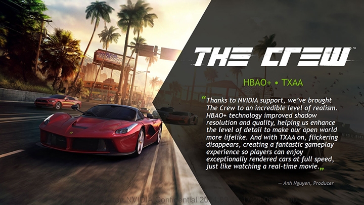 О том, как разработки NVIDIA обогащают игру, в ролике рассказывает директор по кинематографии проекта Себастьян Лабан (Sébastien Laban). В гоночной аркаде задействованы технологии TXAA и HBAO+, которые используются в Assassin’s Creed Unity и Far Cry 4, а также в Watch Dogs, Assassin’s Creed IV: Black Flag и Far Cry 3. Первая из них, технология временно̀го сглаживания, делает изображение более чётким и плавным, а вторая, продвинутая система глобального затенения, обеспечивает глубокие, реалистичные и детализированные тени.