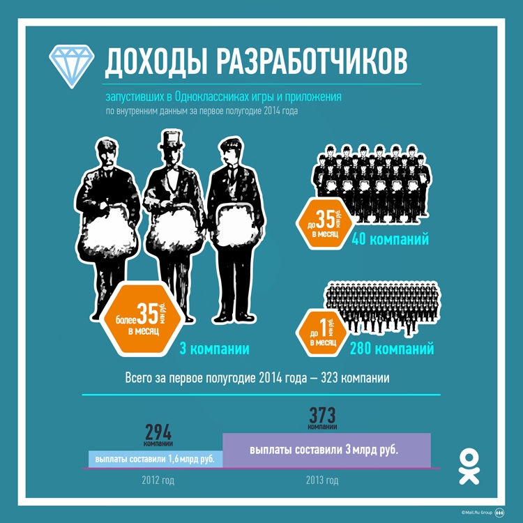 Сейчас 280 компаний зарабатывают на приложениях, размещённых на игровой платформе соцсети, до 1 миллиона рублей ежемесячно. 40 компаний каждый месяц получают от 1 до 35 миллионов. И три компании в 2014 году зарабатывают ежемесячно свыше 35 миллионов рублей.