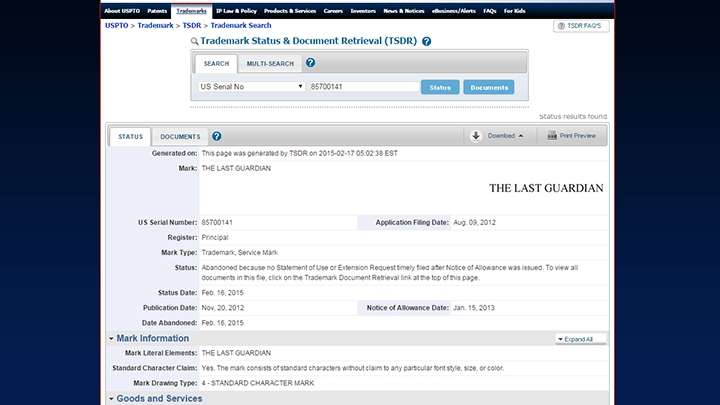 Надо сказать, что происходит это не впервые: в августе 2012 года Sony тоже не стала продлевать срок на право владения торговой маркой, зарегистрированной под серийным номером 77750563. Однако слухи об отмене The Last Guardian тогда не подтвердились: вскоре после этого компания предприняла необходимые действия, чтобы оставить за собой этот торговый знак.
