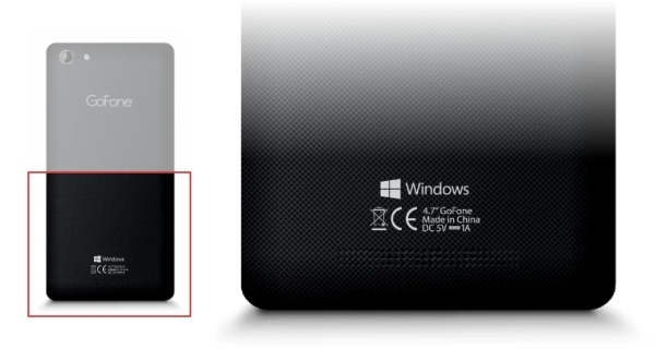 На задней панели смартфона My Go GoPhone GF47W можно увидеть лишь бренд Windows без привычного «Phone».