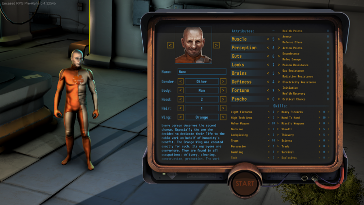 В стиле Fallout и других классических RPG, Encased позволит взаимодействовать с миром и влиять на его дальнейшую судьбу. Будучи новичком в команде, вы должны выбрать один из пяти отделов корпорации C.R. O.N.U. S., куда хотите вступить: вооружённые силы Чёрного крыла, учёные, медики и исследователи Белого крыла, инженеры и техники Синего крыла и высшее руководство Серебряного крыла. Кроме того, есть ещё одно подразделение — Оранжевое крыло, — куда входят бывшие заключённые, которые обменяли свои тюремные комбинезоны на униформу разнорабочих C.R. O.N.U. S.