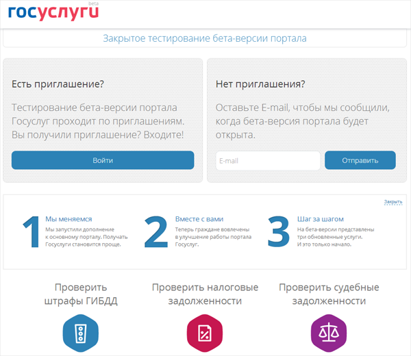 Новая версия портала госуслуг расположена по адресу beta.gosuslugi.ru и доступна для тестирования по приглашениям, рассылаемым оставившим свой e-mail пользователям. В настоящий момент в интерфейсе обновленного сервиса представлены три услуги: проверка штрафов ГИБДД (с возможностью оплаты онлайн), проверка налоговых задолженностей и проверка судебной задолженности. «По сути, это дополнение к основному порталу, здесь мы реализуем новые подходы к интерфейсам и дорабатываем их на основе обратной связи от пользователей. Некоторые ссылки пока ведут на текущий портал, но целью нашего бета-тестирования являются не они, а новые интерфейсы трёх услуг», — комментируют свое начинание разработчики, призывающие сетевую аудиторию сообщать обо всех обнаруженных в системе багах и ошибках.