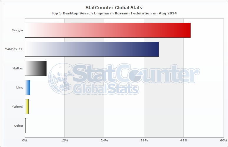Компания StatCounter оценила рыночные доли наиболее востребованных поисковых систем в России и мире по состоянию на вторую половину августа 2014 года.
