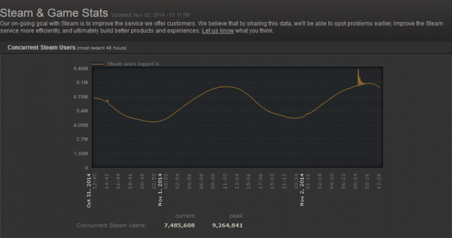 Рекордное количество человек (9 264 841), одновременно использующих данный сервис, было зафиксировано в минувшее воскресенье — 2 ноября. В этот день произошёл всплеск активности пользователей. Вполне возможно, что он был связан с проходившей в этот день хеллоуинской распродажей. Сама же Valve никак не прокомментировала новое достижение своего сервиса.