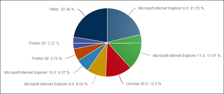 Самой популярной на сегодня версией IE является 8.0 с долей в 21,25%. Далее следуют Internet Explorer 11.0 и Internet Explorer 9.0 с 17,0 и 9,0% соответственно.