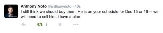 Примечательно, что одновременно с публикацией CNBC в публичный доступ попало Twitter-послание финансового директора этого сервиса микроблогов Энтони Ното (Anthony Noto), в котором он говорит о предстоящей покупке некой компании. «Я по-прежнему думаю, нам следует их купить. Он значится в твоём расписании на 15 или 16 декабря — нам нужно продать его. У меня есть план», — говорится в твите. По всей видимости, это сообщение предназначалось одному из коллег господина Ното, поскольку вскоре после публикации оно было удалено. О чём именно говорил финдиректор, пока не ясно.