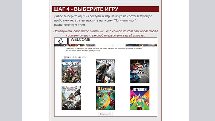 Получить подарок можно только для той же платформы, для которой игрок приобрёл Assassin’s Creed Unity (PC, PlayStation 4 или Xbox One). В случае с консольными версиями необходимо войти в свою учётную запись PlayStation Network или Xbox Live, а затем (независимо от выбранной платформы) нужно авторизоваться в аккаунте Uplay. Принимая условия соглашения, пользователь отказывается от любых притязаний к Ubisoft: если после этого он решит обратиться в суд, шансов выиграть дело у него практически не будет.