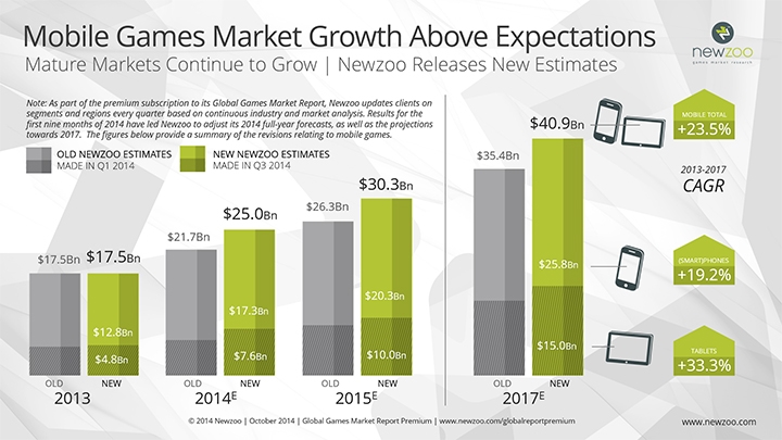 «Newzoo решительно опровергает распространившееся за последнее время мнение о том, что рынок мобильных игр достиг насыщения на зрелых западных рынках, особенно в США, — отметил аналитик компании Винсент ван Дилен (Vincent van Deelen). — Мы также хотим подчеркнуть, что последние финансовые результаты крупнейших игроков рынка, таких как Rovio, King, DeNA и Gree, не в полной мере отражают его состояние. Не в наших интересах завышать показатели, но факты заставили нас поднять прогноз. Мы ожидаем, что вплоть до 2017 года рынок игр для мобильных аппаратов будет расти».