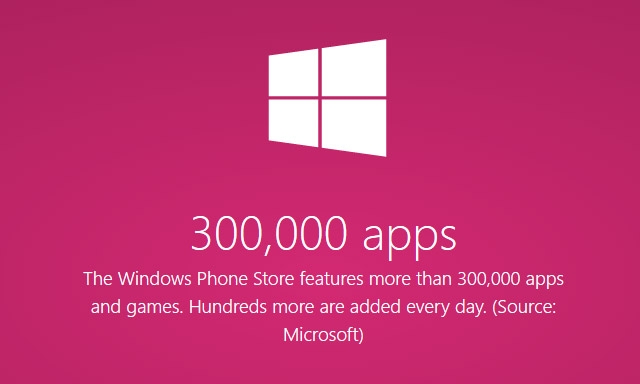 Мобильная операционная система Microsoft сильно отстаёт в этом отношении от ведущих платформ на рынке — Google Android и Apple iOS, так что Windows Phone Store не скоро сможет достичь и половины ассортимента iTunes App Store или Google Play. Тем не менее, прогресс идёт, и для поклонников Windows Phone есть хорошие новости: Microsoft заявляет, что количество приложений в Windows Phone Store перевалило за психологическую отметку в 300 тысяч.
