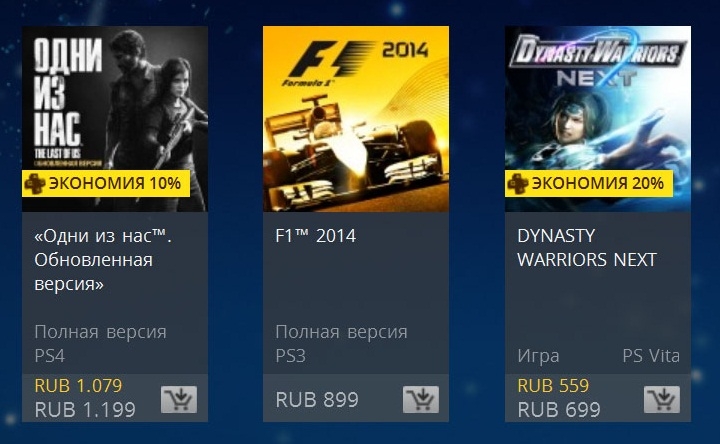 The Last of Us: Remastered для консоли PlayStation 4 — €24,99 или 1 199 руб. (скидка 50%); F1 2014 для PlayStation 3 — €19,99 или 899 руб. (скидка 70%); Dynasty Warriors Next для PS Vita — €14,99 или 699 руб. (скидка 60%). Те же, кто являются подписчиками сервиса PlayStation Plus, получат дополнительные скидки. В случае с переизданием приключенческого экшена The Last of Us цена будет снижена ещё на 10%, а при покупке слэшера Dynasty Warriors Next — на 20%.