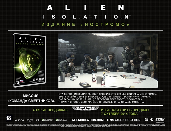 [embedded content] Оформить предзаказ электронной PC-версии Alien: Isolation можно в сервисе цифровой дистрибуции Steam за 999 руб. В качестве бонуса забронировавшие игру также получат две вышеописанные миссии. Российская премьера игры запланирована на 7 октября этого года.
