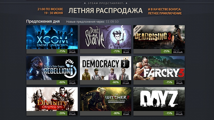 Скидки первого дня распространяются на следующие игры: Don«t Starve (86 руб.), Far Cry 3 (149 руб.), расширенное издание The Witcher 2: Assassins of Kings (83 руб.), XCOM: Enemy Unknown (149 руб.), Democracy 3 (151 руб.), предзаказ Dead Rising 3 (599,25 руб.), Divinity: Original Sin (479 руб.), DayZ (849 руб.) и Sins of a Solar Empire: Rebellion (139 руб.). По сниженным ценам продаются не только игры в перечисленных категориях, но и многие другие, не попавшие на главную страницу магазина. Так, у игроков есть возможность сэкономить на покупке Broken Age (300 руб.), Enslaved: Odyssey to the West (124 руб.) и Payday 2 (164 руб.).