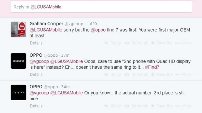 Как это обычно бывает в подобных случаях, оппонент в лице китайской компании решил остроумно прокомментировать запись насчёт технологической инновации смартфона G3. Представители Oppo весьма изящно пошутили в твиттере, подведя итог, что даже третье место для LG в общем зачёте — это очень даже хороший результат.
