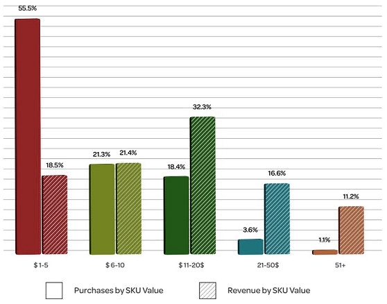 55% всех виртуальных покупок приходится на приобретения отдельных предметов или другого контента стоимостью до $5, однако такие платежи приносят только 18,5% общего дохода. Наконец, микротранзакции дороже $50 составляют лишь 1% от всех покупок, что равняется 11% дохода условно-бесплатных игр для смартфонов и планшетов.