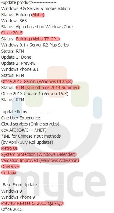 Помимо Windows 9 в представленном myce.com документе упоминается Office 2015, который также должен быть представлен в следующем году.
