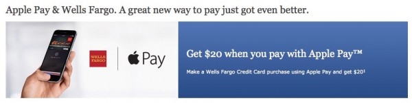 Банковская компания Wells Fargo решила поощрить владельцев Apple iPhone 6 и Apple iPhone 6 Plus к более активному использованию сервиса Apple Pay, предложив небольшой кредит в $20 при покупке товара. Для того чтобы получить кредит, клиент должен произвести оплату за приобретённый в магазине товар с использованием сервиса Apple Pay и кредитной карты Wells Fargo. В случае оплаты дебетовой картой или предоплаченной сумма кредита будет меньше — $10. Акция действует до 30 ноября.