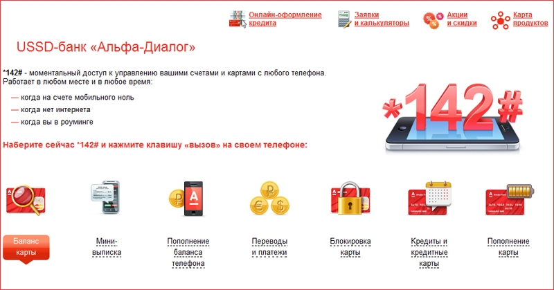 С 1 декабря 2014 года клиентам «Альфа-Банка» доступен уникальный для России сервис — мобильный банк «Альфа-Диалог», доступ к которому осуществляется путём передачи USSD-команд.