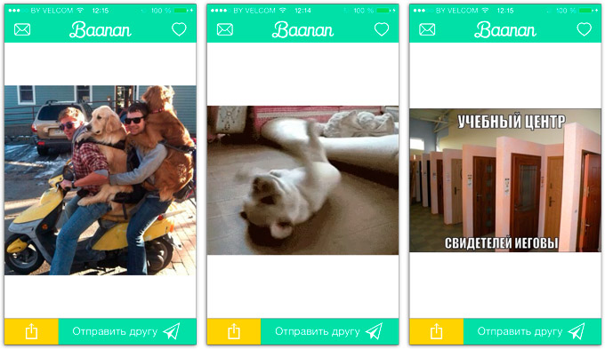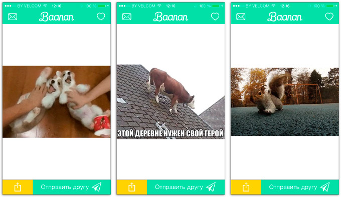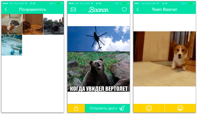 Разумеется, самое главное в подобном приложении — контент. Поверьте, он в Baanan на высшем уровне. Все шутки для приложения отбираются модераторами вручную, поэтому здесь соблюден необходимый уровень культуры и цензуры, что особенно важно, если к приложению могут получить доступ дети. Что касается непосредственно наполняемости, то тут никаких проблем: коты, собаки, еноты, традиционные герои мемов — все это присутствует в лучшем виде. Очень много внимания уделено коротким анимациям в формате GIF. Примечательно, что они воспроизводятся в приложении на порядок лучше, чем в браузере Safari. Это сильно бросается в глаза.