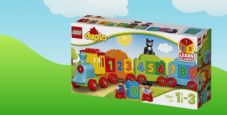 Яркий поезд LEGO с вагонами и цифровыми блоками. Подойдет для детей от полутора до трех лет.