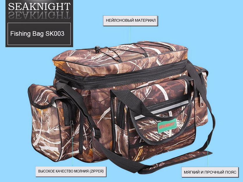 Интересная «рыбацкая» сумка с множеством карманов, ручек и отделений. Есть даже обвес для крепления внешнего груза на карабинах.