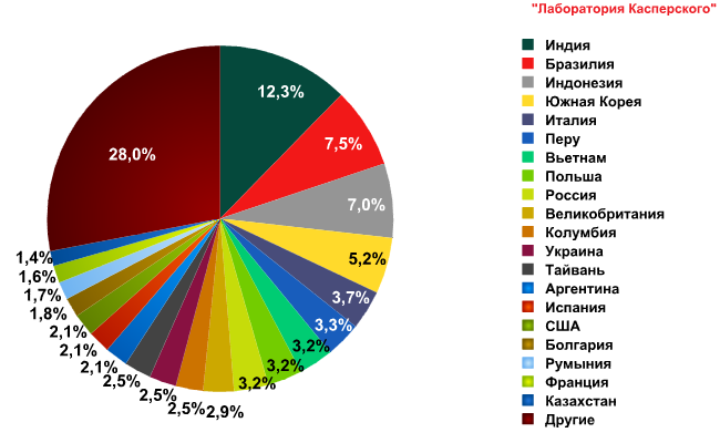 Большие изменения произошли среди стран-распространителей незапрошенной корреспонденции. Лидер 2010 года, США (-9,24%), по итогам прошедшего года даже не вошли в первую десятку рейтинга. Аналогичным образом изменились и позиции России (-2,8%), которая переместилась с 3-й на 9-ю строчку. На вершине же пьедестала обосновалась Индия (+4%), прежде занимавшая второе место. Далее за ней следуют Бразилия (+3,4%) и Индонезия (+5,15%), поднявшиеся с 5-й и 16-й позиции соответственно. Региональное распределение источников спама, напротив, не претерпело существенных изменений, и больше всего почтового мусора по-прежнему распространяется с территории государств Азии, Латинской Америки и Восточной Европы.