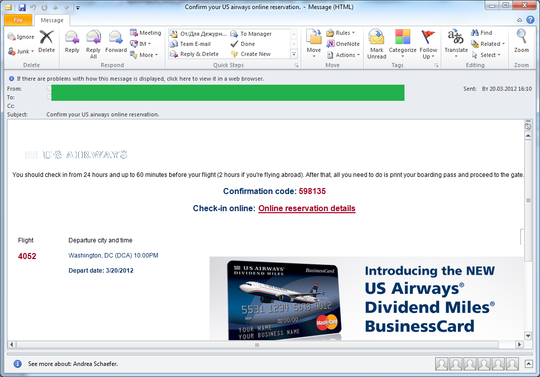 Наиболее ярким примером этого стала зафиксированная в период с 20 по 23 марта рассылка сообщений, подделанных под электронные подтверждения о приобретении авиабилета. В письме предлагалось пройти онлайн-регистрацию на рейс, запланированный на 20 марта. Для этого необходимо было перейти по указанной ссылке. После перехода на компьютер устанавливался троянец, который затем загружал печально известную вредоносную программу ZeuS/Zbot, предназначенную для кражи данных клиентов различных платежных онлайн-сервисов.